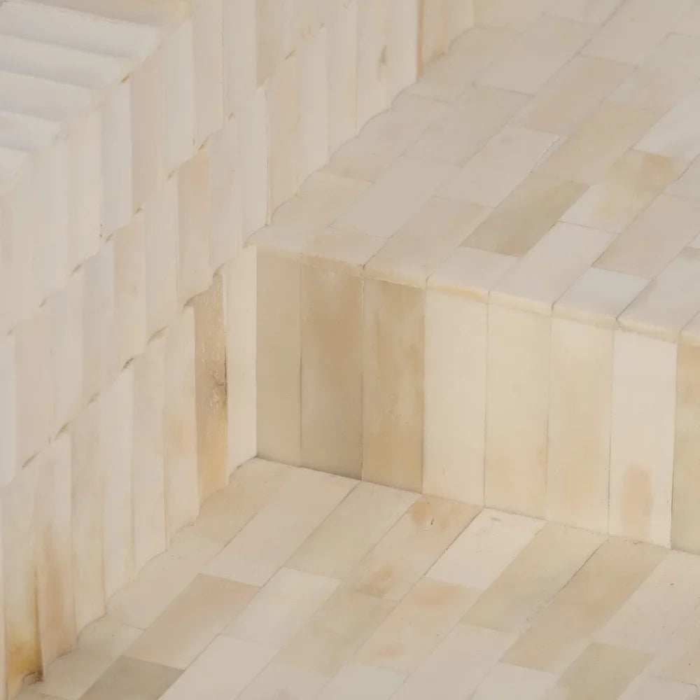 A sculptural statement in soft neutrals, the Tiffany Coffee Table is hand-carved in natural bone, showcasing layered, curved tiers that play with volume and symmetry. Its bold architectural silhouette feels both contemporary and timeless. A conversation-starting centre piece for living spaces that embrace texture and artisanal depth.